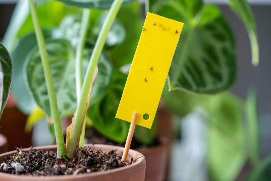 Legen Sie gelbe Klebeplatten auf die Erde in den Töpfen – ihre Farbe zieht ausgewachsene Tiere an, die daran haften bleiben. Durch die Verwendung von Klebeplatten lässt sich die Anzahl der fliegenden Insekten schnell reduzieren.